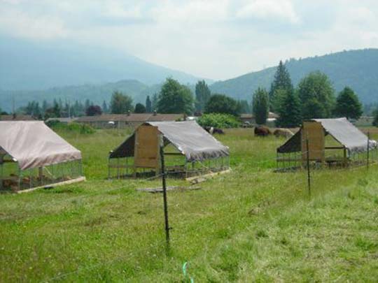 This is a cool picture of the pasture pens for the meat chickens. We have found that the transition from the brooder to