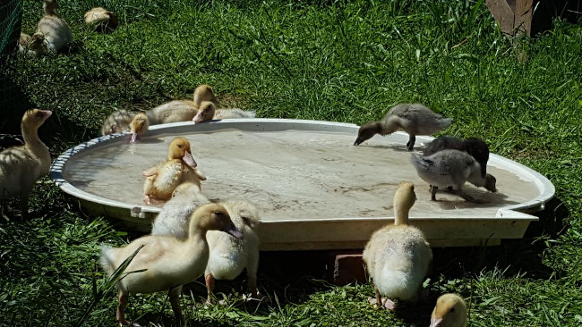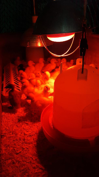 When the chicks arrive we start them on hard boiled eggs (from our flock of organically fed chickens) and raw goats milk (from our dairy goats that are fed a non grain, mostlry organic diet) for the first day. Then for the rest of their time in the brooder they eat a certified organic grain mix. When they go out to the pasture the grain mix transitions to a grower feed, also certified organic. Their diet also consists of grasses, seeds, other vegetation and any bugs that happens to wander into their pen.